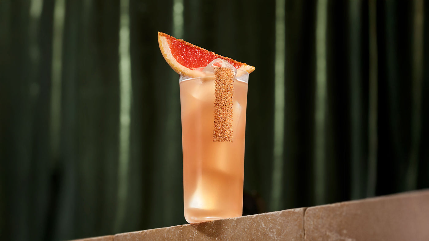 Combine all ingredients except garnish with ice into a shaker and stir. Then, strain into a highball glass with fresh ice, and garnish with a salted or TajĂn dipped grapefruit wedge.