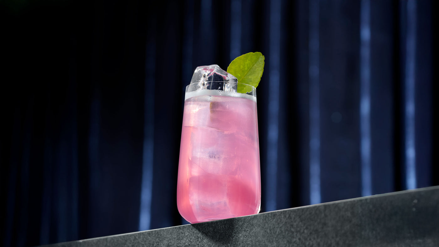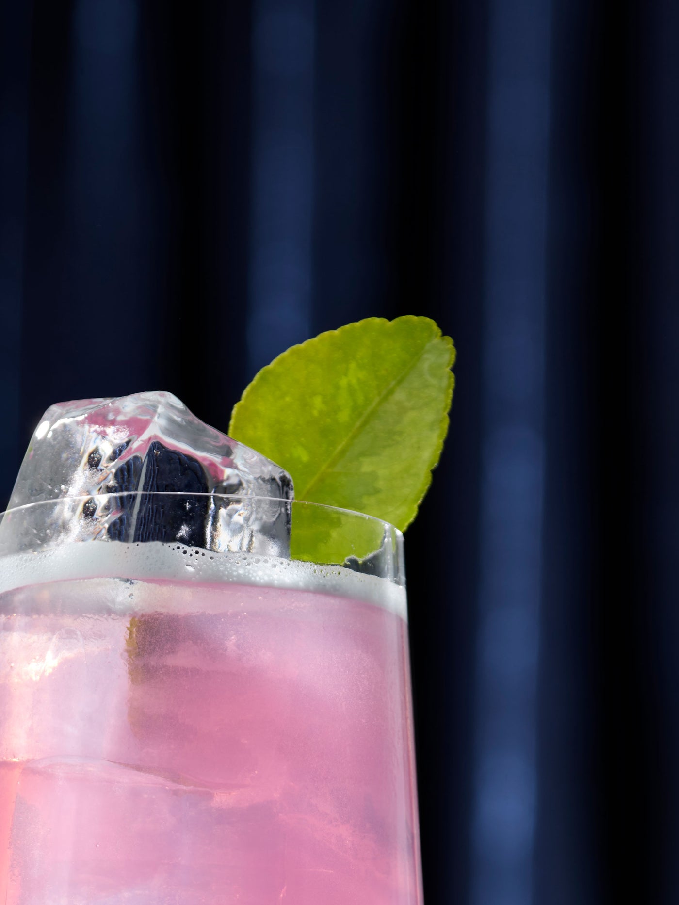 Shake all ingredients except soda and garnish with ice for ca. 15 seconds until chilled. Next, strain into a highball glass, top with soda, and garnish with a kaffir lime leaf.